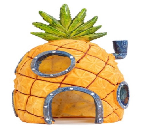 Decoración tematica de bob esponja, de plastico resistente al agua, colores de una piña amarillo y verde.